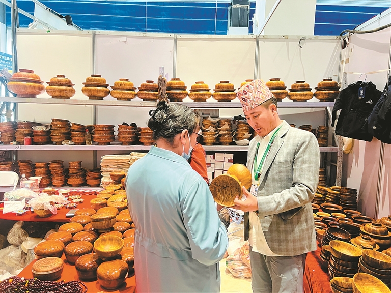 為期5天的博覽會現(xiàn)場熱鬧非凡。入口處,紅底黃字的“外貿(mào)優(yōu)品展銷”橫幅格外醒目:阿富汗商人正用不太流利的中文講解手工羊毛地毯的編織工藝;不丹展臺前,試穿傳統(tǒng)服飾的市民絡(luò)繹不絕;泰國膏藥展位的工作人員手持產(chǎn)品說明書,耐心地向顧客介紹使用方法;印度尼西亞展臺飄來咖啡焦香與伊朗藏紅花的辛香,幾位游客正輕嗅小瓷勺中的藏紅花;一旁的巴基斯坦玉石展臺前,觀眾正用手機(jī)拍攝玉飾的水波紋路,工作人員及時(shí)遞上放大鏡并介紹:“您看這紋路,是巴基斯坦特有的礦料形成的。”雙語講解聲、詢價(jià)議價(jià)聲、游客贊嘆聲交織在一起,宛如一場生動的“國際市集”。
