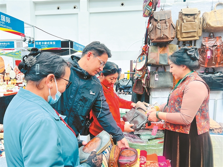西藏本土特色產(chǎn)品同樣是展會的亮點(diǎn)。在非遺展區(qū),藝人們正向游客傳授唐卡選購技巧;藏式食品銷售區(qū)更為熱鬧,工作人員為游客遞上酥油茶:“趁熱喝,配青稞餅更地道!”不少游客端碗坐在藏式卡墊上,一邊品嘗一邊交流,手中還拿著剛購買的唐卡圖案布袋,神情喜悅。