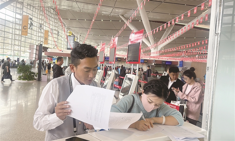 9月14日,萬女士按時抵達拉薩貢嘎國際機場祥鵬航空值機柜臺。地面服務工作人員認真查看了《動物檢疫合格證明》、寵物疫苗注射證明等材料,迅速為萬女士辦理了相關(guān)乘機手續(xù)。隨后,工作人員全程提供陪同服務,先與機場安檢部門積極協(xié)調(diào),幫助萬女士和寵物高效通過安檢;接著引領(lǐng)萬女士登機,并與航班客艙經(jīng)理做好詳細交接。