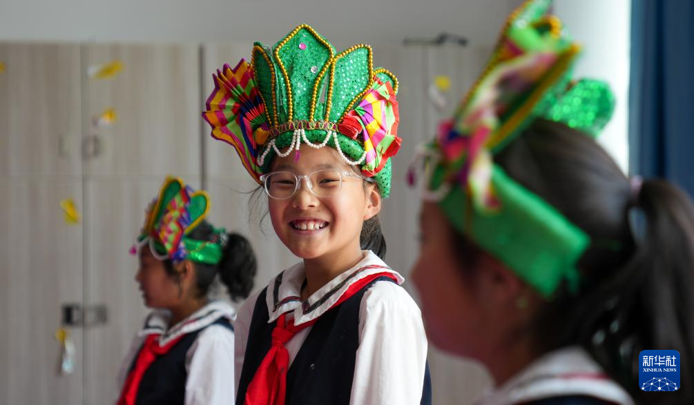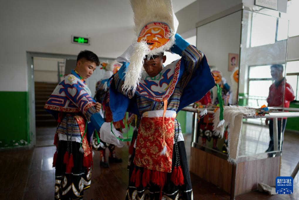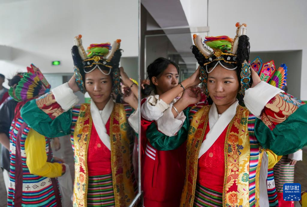9月9日,在拉薩市第二中等職業(yè)技術(shù)學(xué)校,孩子們在穿戴藏戲表演服飾。新華社記者 張笑宇 攝