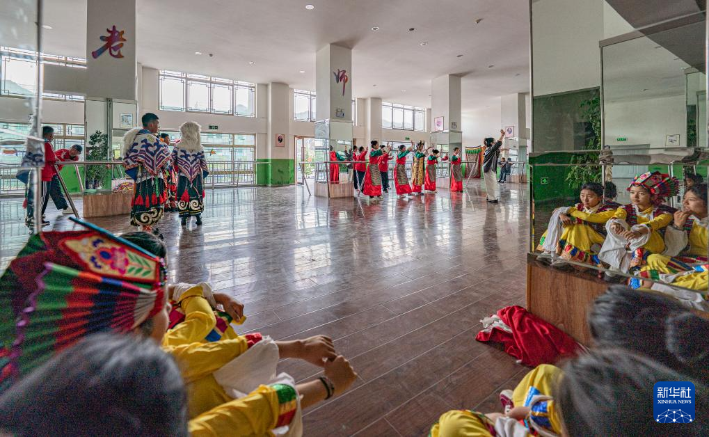 9月9日,在拉薩市第二中等職業(yè)技術(shù)學(xué)校,孩子們在練習(xí)藏戲。新華社記者 丁增尼達 攝