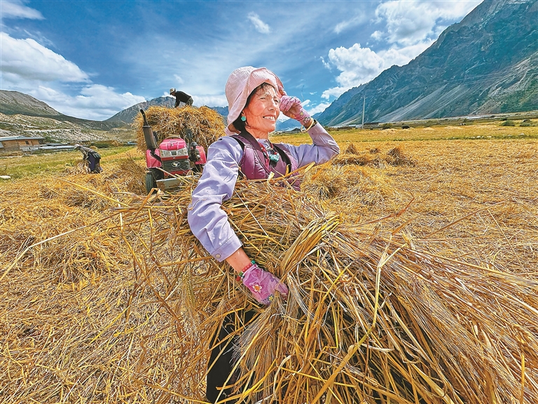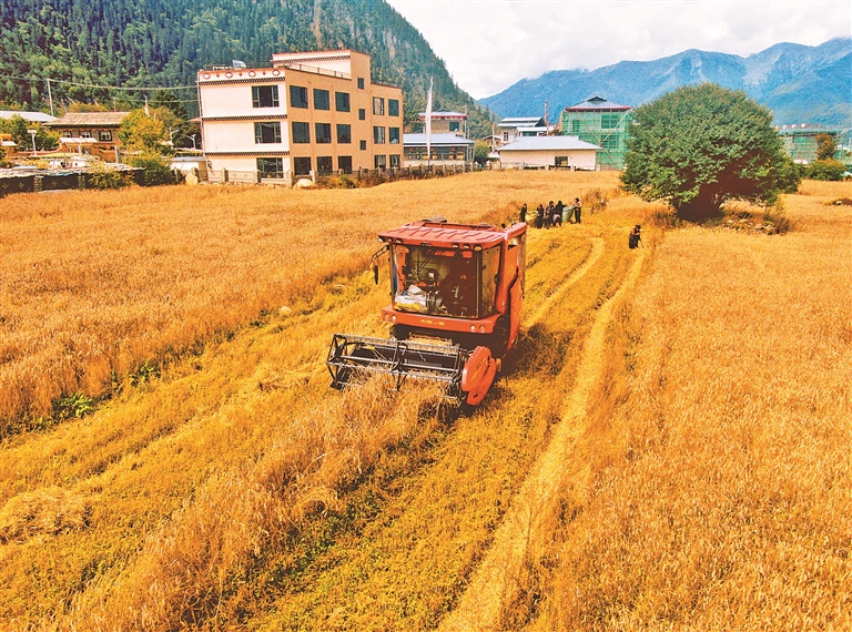 在拉薩市墨竹工卡縣唐加鄉(xiāng)莫沖村,田間地頭繁忙景象撲面而來。幾臺大型收割機(jī)轟鳴著在金色的農(nóng)田里來回穿梭,收割、脫粒一氣呵成,村民們跟在機(jī)器后方,有條不紊地進(jìn)行后續(xù)整理工作,呈現(xiàn)出一派熱火朝天的豐收場景。村民貢嘎頓玉向記者介紹,“我家共有37畝農(nóng)田,10畝種小油菜,27畝種青稞。以前全家4口上陣得忙上一個多月,現(xiàn)在有了機(jī)械化作業(yè),短短幾天就能完成所有秋收工作,既省時又省力。”