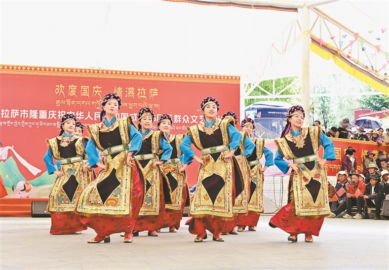 10月1日,宗角祿康公園內(nèi)歌舞飛揚、歡聲雷動,“歡度國慶·情滿拉薩”拉薩市隆重慶祝中華人民共和國成立76周年群眾文藝演出在這里舉行。演出現(xiàn)場氣氛熱烈,富有民族特色的藏戲、傳統(tǒng)歌舞接連上演,歌聲、掌聲、歡呼聲此起彼伏,生動表達了拉薩各族人民對偉大祖國的美好祝愿。圖為女子舞蹈《春韻》。記者 王敏 攝
