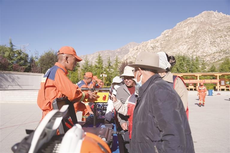 在資料發(fā)放環(huán)節(jié),大隊宣傳員向過往群眾遞發(fā)《森林防火條例》摘要手冊及防災減災科普折頁等宣傳資料200余份,確保防災政策、防火常識“廣覆蓋、無遺漏”;案例講解環(huán)節(jié),宣傳人員結(jié)合周邊近年防災減災典型案例與森林火災真實事件,用藏漢雙語解讀違規(guī)用火、災害應(yīng)對不當?shù)膰乐睾蠊鞔_違反相關(guān)規(guī)定的法律責任,讓群眾直觀感受到防災減災與防火的緊迫性;裝備展示區(qū),專業(yè)救援車輛、滅火器材及救援裝備逐一陳列,大隊宣傳員細致講解各類裝備的用途與操作原理,既充分展現(xiàn)應(yīng)急救援實力,也有效加深群眾對防災減災、防火救援工作的認知;有獎問答與答疑環(huán)節(jié),通過趣味互動充分激發(fā)群眾參與熱情,針對家庭用火安全、日常防災避險、林區(qū)作業(yè)防火等常見疑問,宣傳員耐心解答、細致指導,做到“有問必答、解惑到位”。