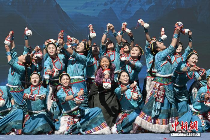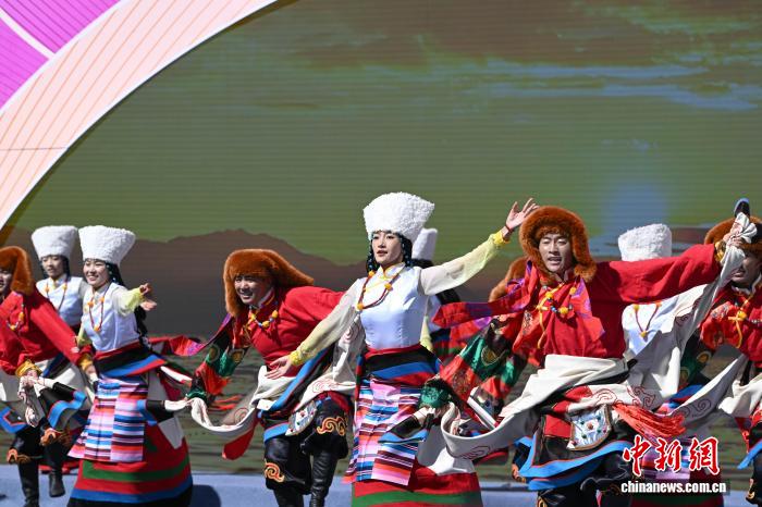 圖為阿里地區(qū)改則縣藝術團表演舞蹈《歡舞幸?!じ膭t情》。中新社記者 貢嘎來松 攝