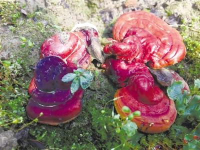 在這個(gè)培育房里,一排排貨架上整齊擺放著靈芝菌菌袋,如果仔細(xì)看,有的菌袋扎口處已經(jīng)冒出白色的菌絲。再經(jīng)過(guò)一段時(shí)間的發(fā)菌,就可以種植到地上使之繼續(xù)生長(zhǎng)了。而在稍遠(yuǎn)一點(diǎn)的一個(gè)大棚里,已經(jīng)種植到地里的菌袋正在陽(yáng)光和水汽的照拂下繼續(xù)生長(zhǎng)。程攀說(shuō):“因?yàn)檫@里晝夜溫差大,所以溫室大棚棚頂都要蒙上黑色遮光布,白天遮擋陽(yáng)光,保持適當(dāng)?shù)臏囟群蜐穸?,這樣才有利于靈芝菌的生長(zhǎng)。”