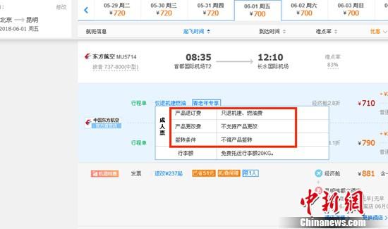 記者在攜程網(wǎng)上預(yù)訂6月1日北京到昆明的東方航空MU5714票價為710元(2.8折),顯示“只退機(jī)建、燃油費(fèi)”“不支持產(chǎn)品更改”。