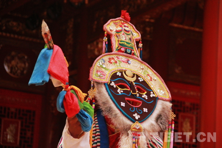 圖為拉薩市城關(guān)區(qū)娘熱民間藝術(shù)團(tuán)演員多吉次仁表演國(guó)家級(jí)非物質(zhì)文化遺產(chǎn)“嘎?tīng)枴睌z影:劉莉