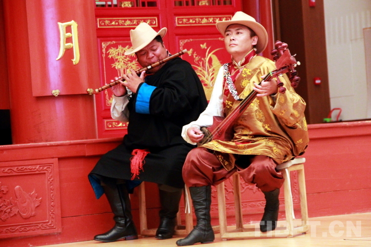 圖為拉薩市城關(guān)區(qū)娘熱民間藝術(shù)團(tuán)樂(lè)師米瑪(左)和拉巴次仁(右)為演出伴奏。米瑪是西藏自治區(qū)級(jí)嘎?tīng)杺鞒腥?,?dān)任藝術(shù)團(tuán)笛子演奏、司鼓;拉巴次仁是拉薩市城關(guān)區(qū)級(jí)喇嘛瑪尼傳承人,擔(dān)任藝術(shù)團(tuán)扎木年演奏。攝影:劉莉