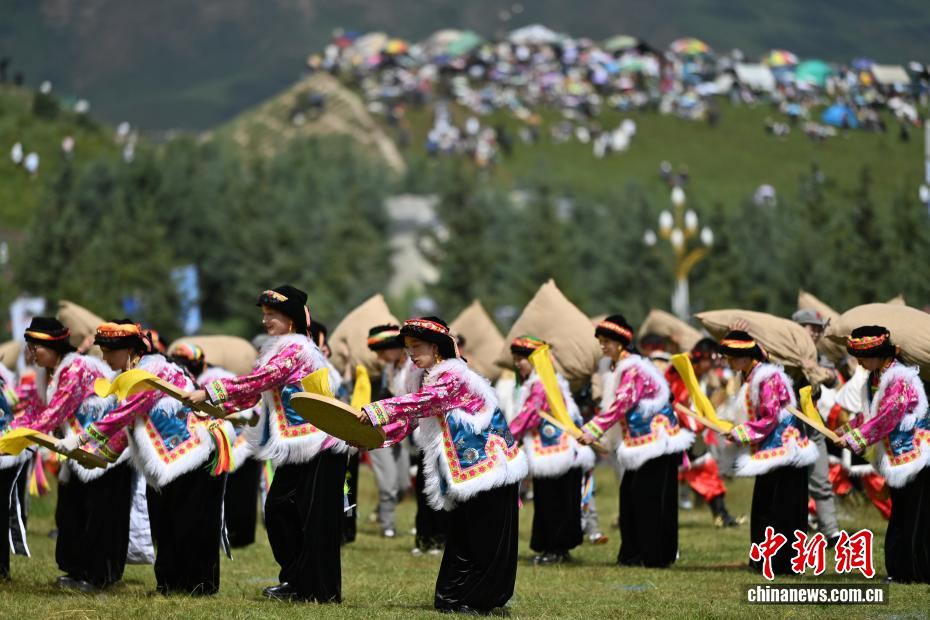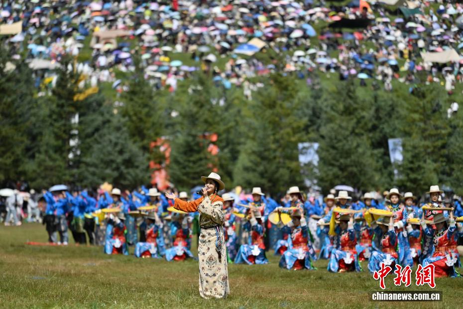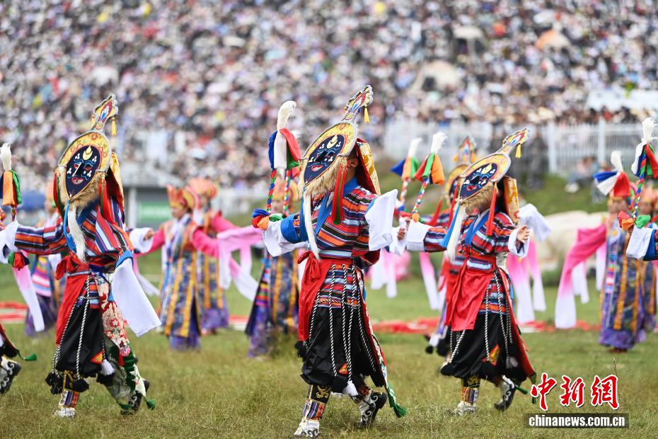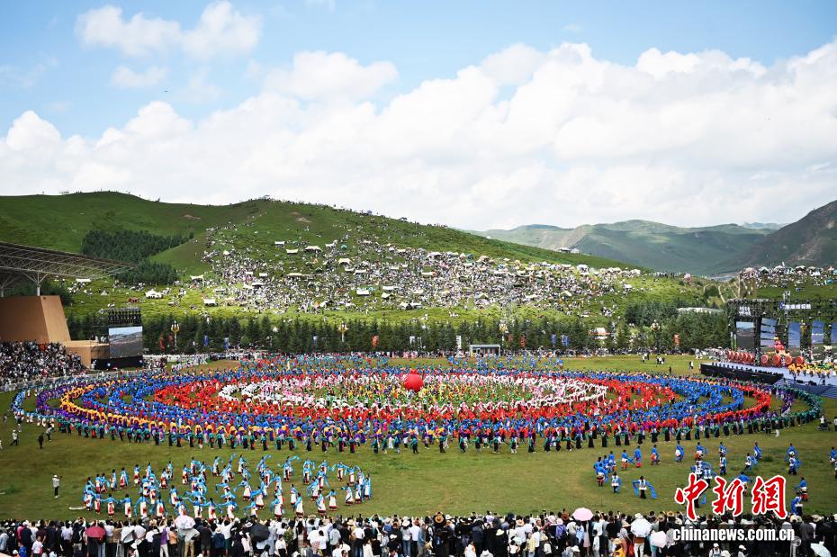 圖為開幕式現(xiàn)場(chǎng)“萬(wàn)人鍋莊”表演。中新社記者 九美旦增 攝